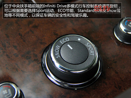 英菲尼迪JX35配備了一臺模擬6速的CVT變速箱,以保證車輛行駛的平順性和舒適性,位于中央扶手箱前端的Infiniti Drive多模式行車控制系統調節旋鈕,可以根據需要選擇Sport運動、ECO節能、Standard標準及Snow雪地等不同模式,以保證車輛的安全性和駕駛樂趣。