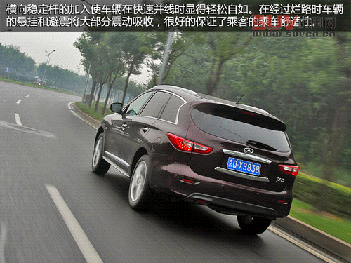 英菲尼迪JX35搭載了代號為VQ35的V6引擎,最高功率204KW,最大扭矩達到了336NM,值得一提的是,VQ系列發動機連續14年獲得沃德世界十佳發動機的稱號。英菲尼迪的動力儲備十分充足,3.5L的排量驅動一臺超過兩噸的龐然大物毫不費力,在實際駕駛中發動機的平順性值得稱道,即使你將油門踏板踩到底,發動機也會非常線性的將源源不斷的動力釋放出來,特別要說的是,英菲尼迪JX的車內靜音效果非常出色,怠速時幾乎感受不到發動機帶來的震動和噪音,即使是高速行駛,你能分辨出來的也只是路噪和風噪。