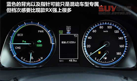 儀表盤視覺效果也同樣出眾,藍色的背光以及指針可能只是混動車型專屬,但檔次感要比現款RX強上很多。不過我們倒是希望下一代RX上也會裝備全液晶儀表盤,這樣才能與外型、內飾形成更好的結合。