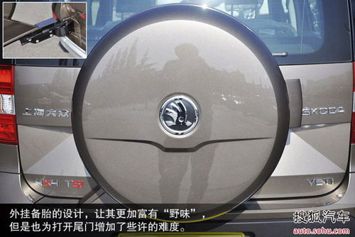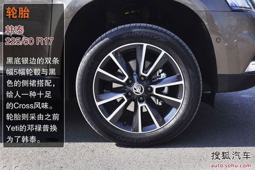 車身側面輪廓并沒有太多改變,只是在一些細節上有所提升,而軸距的加長讓我們可以明顯看出野帝的后門的加長。車頂銀色行李架對于SUV車型來說是一個不可或缺的配置,不求有多少實用性,視覺效果到位了。黑底銀邊的雙條幅5幅輪轂與黑色的側裙搭配,給人一種十足的Cross風味。輪胎尺寸為225/50 R17,輪胎則采由之前Yeti的鄧祿普換為了韓泰。