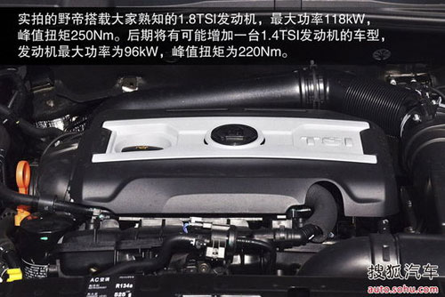 實拍的野帝搭載大家熟知的1.8TSI發動機,最大功率118kW,峰值扭矩250Nm,匹配的變速箱為6速DSG。后期將有可能增加一臺1.4TSI發動機的車型,發動機最大功率為96kW,峰值扭矩為220Nm,匹配的變速箱為7速DSG。出身PQ35平臺的野帝,采用也與途觀完全相同的前麥弗遜后多連桿懸掛。