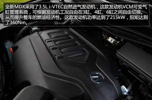 全新MDX采用了3.5L i-VTEC自然進(jìn)氣發(fā)動(dòng)機(jī),這款發(fā)動(dòng)機(jī)VCM可變氣缸管理系統(tǒng),可根據(jù)發(fā)動(dòng)機(jī)工況自由在3缸、4缸、6缸之間自由切換。從而提升整車的燃油經(jīng)濟(jì)性。這款發(fā)動(dòng)機(jī)功率達(dá)到了215kW,扭矩達(dá)到了360Nm。與發(fā)動(dòng)機(jī)配合的是一款6檔手自一體變速箱,并且提供了方向盤換擋撥片。同時(shí),變速箱模式也可以選擇,在擋桿下方有“綜合動(dòng)力”按鈕,按動(dòng)后將在儀表出現(xiàn)“舒適”“標(biāo)準(zhǔn)”“運(yùn)動(dòng)”三種模式可供選擇。