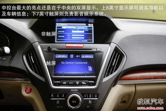 中控臺最大的亮點還是在于中央的雙屏顯示。上8英寸顯示屏可現實導航以及車輛信息;下7英寸觸屏則負責影音娛樂系統。全新謳歌MDX高配車型中為后排車殼提供了一個16.2英寸可分屏顯示的娛樂顯示屏。