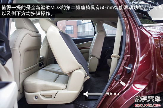 第二排空間同樣十分充裕,在前排座椅正常距離的情況下,體驗者腿部距離前排座椅椅背尚有兩拳距離,而頭部也有一拳距離。而座椅中央可折疊的中央扶手可供后排乘客放置水杯。另外值得一提的是,全新謳歌MDX的第二排座椅可以提供50mm的智能滑動功能,方便第三排乘客出入。