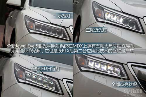 前臉最大的亮點在于全新Jewel Eye 5眼光學照射系統的加入,相較RLX的十顆復眼的夸張造型,全新MDX單排5顆更大直徑的全LED光源更兇狠更吸引眼球。外部三顆“瞳孔”為近光燈、內部兩顆為遠光照明,每顆頂部都設計有薄薄一層LED燈條(日行燈),配合鋒利的鍍鉻裝飾矜持中蘊含著攝人霸氣,不怒自威。