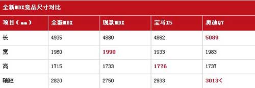 車身尺寸方面,全新換代MDX將整體定位進行調整,從現款車型強調高度的方向轉變為追求全面的均和與協調。長度加大55mm、寬度及高度分別縮小30mm和18mm,軸距加大70mm,身形更加袖長,更符合豪華都市SUV沉穩的調性。與競品寶馬X5、奧迪Q7相比,尺寸表現依舊中規中矩。