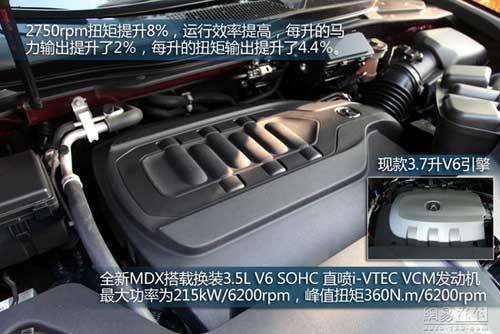 動力部分新車將老款的3.7升引擎換為眼前的3.5升全新V6引擎,全新一代智能引擎系統由i-VTEC(可變氣門正時及升程控制系統)、VCM(Variable Cylinder Management,智能動力管理)系統及缸內直噴等三項核心技術整合而成,發動機自體懸掛幫助引擎在3缸與6缸相互切換提供更穩定的工作狀態,提高數據表現的同時,也將帶來更好的燃油經濟性。