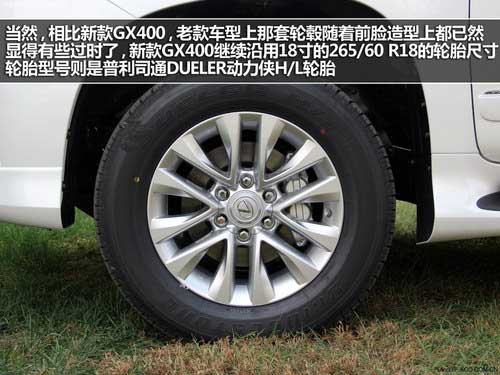 當然,相比新款GX400,老款車型上那套輪轂隨著前臉造型上都已然顯得有些過時了,新款GX400繼續沿用18寸的265/60 R18的輪胎尺寸,輪胎型號則是普利司通DUELER動力俠H/L輪胎,這款越野型胎舒適性同樣非常不錯。