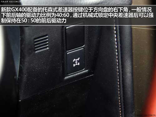 新款GX400配備的托森式差速器按鍵位于方向盤的右下角,一般情況下前后軸的驅動力比例為40:60,通過機械式鎖定中央差速器后可以強制保持在50:50的前后驅動力。而之所以采用托森式差速器,一方面是響應速度快,承受力大,另一方面機械式差速器可靠性更強。