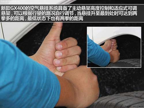 新款GX400的空氣懸掛系統具備了主動懸架高度控制和適應式可調懸架,可以根據行駛的路況自行調節,當懸掛升至最到處時可達到兩拳多的距離,最低狀態下也有兩拳的距離。