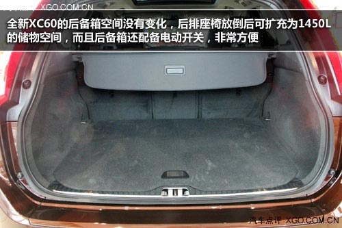 全新XC60的后備箱空間沒有變化,后排座椅放倒后可擴充為1450L的儲物空間,而且后備箱還配備電動開關,非常方便。