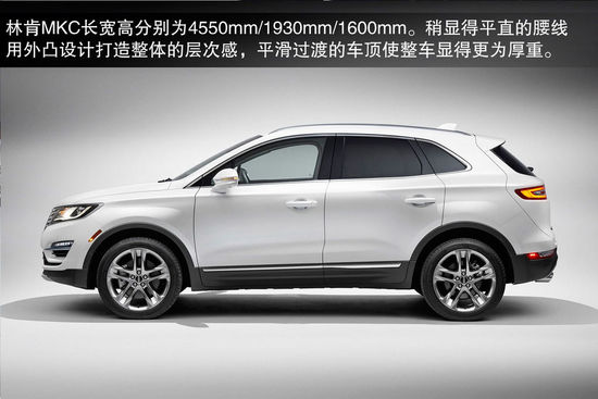林肯MKC來源于同名概念車MKC Concept。與非常驚艷的概念車相比,MKC的量產(chǎn)版幾乎繼承了概念車所有的設(shè)計(jì)。車身的尺寸和比例幾乎沒有發(fā)生任何改變,一些非常出彩的設(shè)計(jì)比如連同尾燈的尾門、優(yōu)美的尾燈造型、俊朗的線條也均得以保留。量產(chǎn)的MKC僅僅更換了更為實(shí)際的車門把手、后視鏡、車窗、保險(xiǎn)杠造型。總而言之,量產(chǎn)版的林肯MKC與MKC概念車一樣有著美艷的外表。林肯MKC是一款中型跨界SUV車型,車長(zhǎng)4550毫米,寬1930毫米,高1600毫米,與作為中型豪華SUV代表車型雷克薩斯RX系列、奧迪Q5和寶馬X3產(chǎn)生極大的威脅。