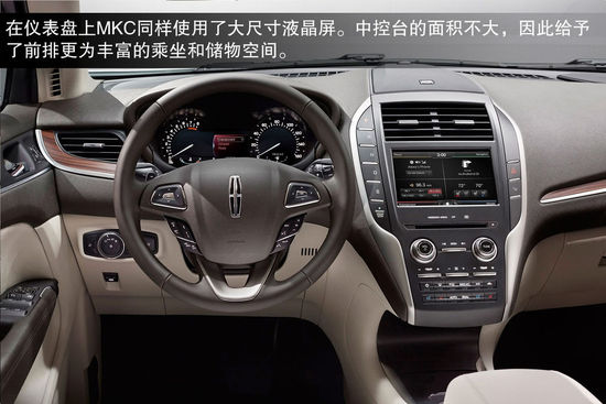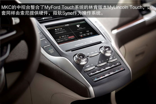 MKC的中控臺(tái)整合了MyFord Touch系統(tǒng)的林肯版本MyLincoln Touch,這套同樣由索尼提供硬件,微軟Sync作為操作系統(tǒng)。除此之外,林肯品牌的標(biāo)志性設(shè)計(jì)-------按鍵換擋的操作方式也得以保留。在儀表盤上MKC同樣使用了大尺寸液晶屏。中控臺(tái)的面積不大,因此給予了前排更為豐富的乘坐和儲(chǔ)物空間。