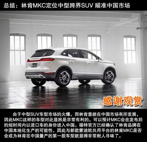 林肯汽車長(zhǎng)時(shí)間以來一直以美國(guó)市場(chǎng)需求作為設(shè)計(jì)依據(jù),對(duì)于單一市場(chǎng)的考量使得其車型非常適合美國(guó)市場(chǎng)但在其他市場(chǎng)表現(xiàn)平平。林肯汽車此前已經(jīng)發(fā)布未來5年的品牌戰(zhàn)略,中國(guó)被納為僅次于美國(guó)的最重要的市場(chǎng)。昨日,林肯汽車發(fā)布了其品牌戰(zhàn)略中至為重要的一款車型——林肯MKC。福特官方已經(jīng)確認(rèn)了林肯品牌在中國(guó)本地化生產(chǎn)的可能性,因此與新款蒙迪歐共用平臺(tái)的林肯MKC是否會(huì)成為林肯在中國(guó)量產(chǎn)的第一款車型就顯得非常耐人尋味了。
