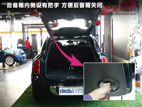 后備箱的開啟為MINI的車標,這不由的讓人想到了大眾的多款車型,后車標開啟后備箱曾是大眾汽車的一大特色。由于開啟后后備箱門開啟較高,COUNTRYMAN很人性化的在內測設置了把手方便了后備箱的關閉。
