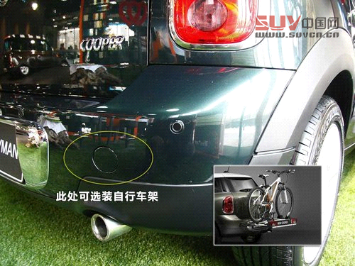倒車雷達是標準配備,排氣筒也進行了鍍鉻處理。值得一提的是車尾部有自行車架作為選裝備件,上邊最多可以放置兩輛自行車,筆者認為這的配置十分有特色,本來就是為節能設計的MINI可以搭載更為節能環保健康的交通工具。