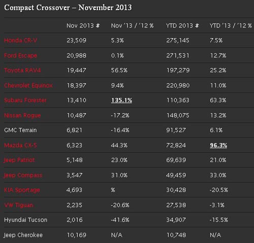 在緊湊型SUV領(lǐng)域,本田CR-V上個月繼續(xù)擴大了領(lǐng)先于福特翼虎(Ford Escape)的優(yōu)勢。翼虎(Escape)如果12月銷售發(fā)展態(tài)勢良好,那么還有可能超越CR-V位居第一。2014款斯巴魯森林人車型月銷量增幅最大,增長了135.1%。今年迄今為止,馬自達CX-5增幅最大,增長了96.3%。豐田RAV4增長勢頭也很強勁,它很可能在全年銷售排行榜上名列第四。