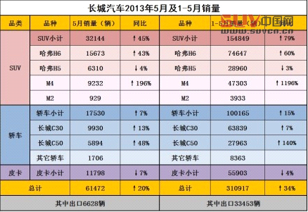 長城汽車前五個月總銷量已經超過31萬輛,達310917輛,同比增長34%。其中SUV系列銷量為154849,同比增長79%;轎車銷量為100,165輛;皮卡銷量為55903輛。前五個月,哈弗H6銷量總計74647輛,同比增長60%;M4銷量為47303輛;C30銷量為63839輛。