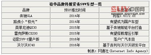 在今年的上海車展期間,奔馳將旗下緊湊型SUV的概念車-GLA concept亮相,從其亮相的地點(diǎn),可以看出未來這款車對于奔馳在華發(fā)展的重要性。從上表中我們可以看出,在未來的三年中,奔馳、路虎、英菲尼迪、雷克薩斯、謳歌、沃爾沃品牌均將推出緊湊SUV車型。其中值得一提的是,即將推出的多款車型中,有不少可以說是專為中國市場所打造的。