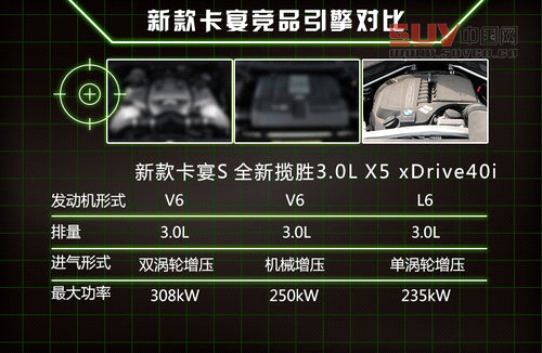 保時捷卡宴作為一款豪華中大型SUV,路虎攬勝及寶馬X5等該級別車型一直是其主要競爭對手。較上述兩款車型相比,新款卡宴所采用的3.0T雙渦輪增壓引擎比路虎全新攬勝搭載的3.0L機械增壓、寶馬X5 xDrive40i使用的3.0T單渦輪增壓發動機性能優勢明顯,最大功率上分別高出58kw和73kw。