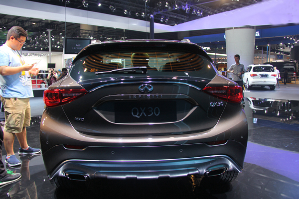 外觀方面,英菲尼迪QX30保留了大量概念車上的設計,整體造型十分前衛。家族式的大尺寸蜂窩狀進氣格柵,配合著兇狠的大燈,讓前臉看起來運動感十足。車身側面線條銳利,并且依然沿用了家族式的C柱新月造型。