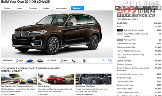 與寶馬3系相似,2014款寶馬X5車型擁有多種型號。消費者可以通過寶馬的官方網站自行選擇其喜歡的2014款寶馬X5車型,添加其希望獲得選擇升級包。據悉,不含任何選裝升級包的2014款入門版寶馬X5 sDrive 35i車型的起售價為52,800美元(折合人民幣33.2萬元),而在選擇全部的升級包之后,該車型的售價變為80,000美元(折合人民幣50.4萬元)。