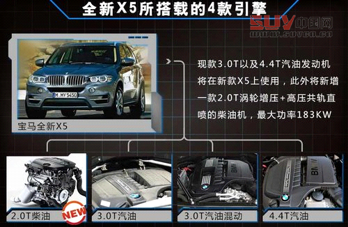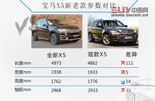 從上面的兩張對比圖中我們可以看出:為滿足消費者對豪華SUV更大駕乘空間的需求,全新寶馬X5將比現款車身尺寸進行全面加大,車身長度為4973mm,較現款車型提高了111mm,寬度也增加了5mm,高度則下降14mm,軸距更是增加至2968毫米,比現款車型增加35毫米。此外全新寶馬X5將搭載一款全新的2.0升渦輪增壓加高壓共軌直噴柴油引擎,最大功率183KW。