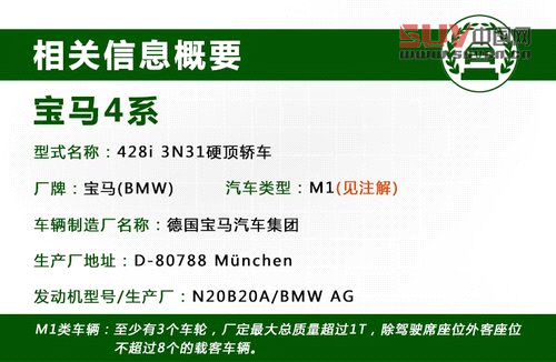 從環保部的信息來看,寶馬4系為汽油車并且將搭載寶馬集團的型號為N20B20A的發動機,此款引擎即是在現款寶馬3系搭載的2.0T高功率渦輪增壓發動機。這款發動機最大功率為180KW,扭矩為350N.m,與之匹配的為8速自動變速器,此款發動機的排放標準為國IV。