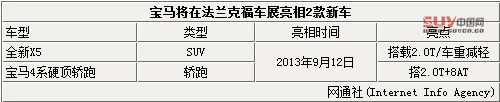 全新BMW X5是世界上最成功的高檔多功能運動車,在駕駛樂趣、豪華和創新方面樹立了全新典范。而寶馬 4系雙門轎跑車則翻開運動轎車的新篇章,本次車展將首次公開展示,在豪華品牌的中級別細分市場里,這款車擁有最高水平的美學吸引力和駕駛樂趣,寶馬全新X5及4系雙門轎跑都將于 9月發布