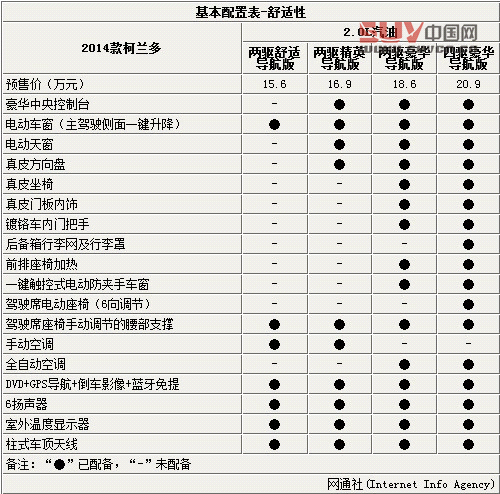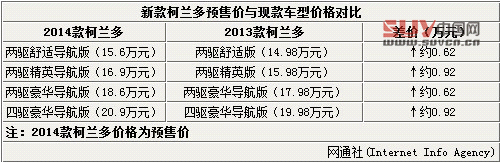 雙龍汽車在不久前宣布2014款柯蘭多將于9月27日正式上市,這款新車將在外觀和配置方面有所升級。近日編輯獲取了該車型的詳細配置信息,新車全系配備了導航、倒車影像等配置。與此同時編輯走訪多家雙龍汽車4S店后獲悉:新款柯蘭多的預售價為15.6-20.9萬元,較現款車型最高上漲了近1萬元左右。