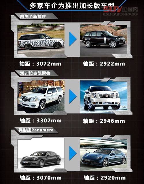 各大廠商為在中國這一全球最大汽車市場中站穩腳跟,均對旗下車型進行加長,以滿足中國消費者對于車身尺寸及空間的“特殊”要求,豪華車型更不例外。其中新款保時捷Panamera較現款車型加長了150mm,達到了3070mm;另外定位在全尺寸SUV的凱迪拉克凱雷德則同樣推出了軸距達到3302mm的加長版ESV車型。而目前在中大型SUV市場中,2922mm的全新攬勝已在該級別市場占有一定優勢,而將軸距加長150mm后的攬勝加長版車型則與部分全尺寸SUV處于同一水平。