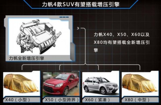 目前力帆在SUV領域中僅有一款定位在緊湊型的SUV車型X60,未來還計劃推出X40(小型SUV)、X80(緊湊型SUV)以及一款小型跨界車X50。力帆汽車銷售公司常務副總經理楊國華接受網通社采訪時表示:SUV車型需要較強的動力系統,未來力帆推出的增壓引擎有望率先搭載到SUV車型上。
