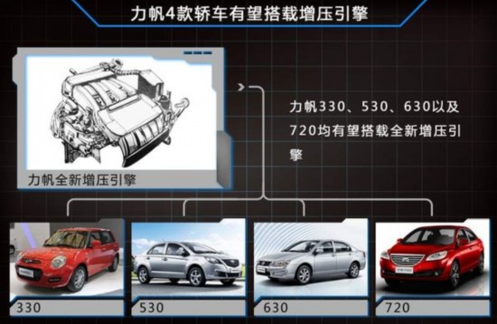 力帆旗下330、530和630三款換代車型在2013年10月18日正式上市,目前其搭載的是1.3L及1.5L自然吸氣發動機。未來力帆推出全新增壓引擎后,這三款車型均有望換搭。除此之外,現款720搭載的是1.8L發動機,未來其也將換搭排量更小的增壓引擎,動力提升的同時,進一步提升燃油經濟性。