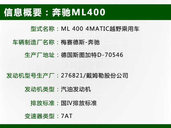 SUV中國網報道 奔馳在2013年9月推出旗艦車型全新S級,新車搭載了型號為M276的3.0T雙渦輪增壓引擎。而對于奔馳現在唯一一款搭載3.5L自然進氣引擎的奔馳ML而言,搭載更小排量的增壓引擎已經成為一個趨勢。近日編輯從國家環境保護部了解到:奔馳ML將推出一款搭載3.0T雙渦輪增壓發動機的車型,新車將命名為“ML400”。與目前的引擎序列相比,更小的排量有助于減小尾氣排放,且根據中國市場的消費稅率3.0T引擎將小幅降低這款車型的稅額。