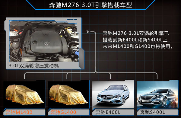 奔馳M276型號的發動機共有兩個排量,分別為3.5L和3.0T,其中前者已經在多款奔馳車型上使用,如S350L、ML等,而后者已經在剛上市不久的新一代E級和全新S級上搭載。據悉這款3.0T雙渦輪增壓引擎未來或將普及到奔馳旗下中高級車型上,除ML400車型外,奔馳的GL400車型未來也將換裝這款更小排量的增壓發動機。