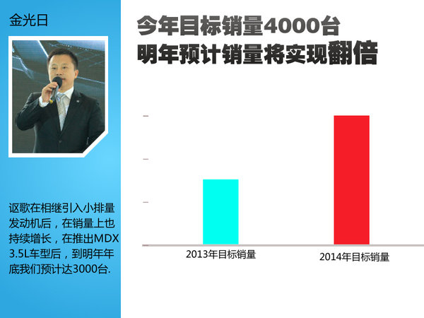 為了使謳歌的銷量盡快的追趕英菲尼迪、雷克薩斯等日系豪華品牌,謳歌在今年可謂全面發力的一年,先后推出了多款改款換代車型。“其中RDX 3.0L以及ILX 2.0L汽油版車型上市后便取得了不錯的成績,而近期上市的MDX 3.5L車型將成為主力車型以及明年將要推出的兩款新車,力爭明年銷量實現翻倍,達到8000臺。”金光日表示。