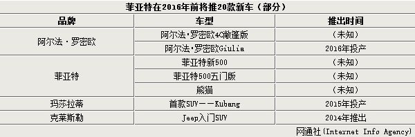 該20款新車除了在意大利生產的超豪華品牌瑪莎拉蒂外,還將包括阿爾法?羅密歐4C敞篷版、Giulia在內的8款阿爾法?羅密歐車型、新500以及500的五門版、Jeep入門級SUV,與不可缺少菲亞特最暢銷車型的熊貓這款小型車。新產涵蓋微型汽車、超小型汽車和緊湊型汽車領域。菲亞特品牌執行總裁奧利維爾?弗朗索瓦(Olivier Francois)曾透露,熊貓系列汽車的目標受眾是經濟型車客戶,而500型汽車更適合那些想要購買高端一些產品的消費者。