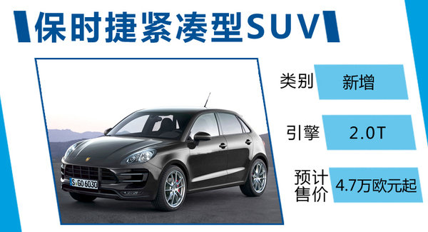 保時捷首款緊湊型SUV將基于奧迪Q3同平臺打造,動力系統也將延用Q3的2.0T渦輪增壓發動機,最大功率為125kw,最大扭矩為280Nm,此舉在擴充產品線的同時也能有效降低研發成本,據有關媒體稱,保時捷首款緊湊型SUV的預計售價將在4.7萬歐元起。