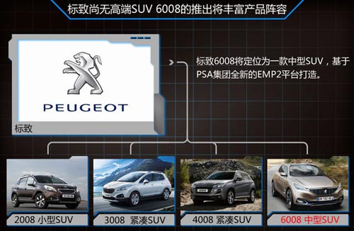 目前標致已針對中國市場推出緊湊SUV-3008,根據神龍公司的規劃,明年還將投產小型SUV-2008。但目前在中級SUV的市場中,標致尚未進軍這一領域。今年神龍第三工廠正式投產,并引入了PSA全新的EMP2模塊化平臺。神龍汽車曾公開表示,這款全新平臺有著很強的可擴展性,可以生產SUV、MPV以及轎車等。