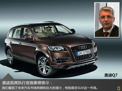 在全球市場中,奧迪的主要競爭對手便是寶馬與奔馳,在跨界SUV領域寶馬是率先推出相應產品的豪華車企,緊隨其后的奧迪也將進一步擴充其SUV產品陣容。截至到目前奧迪已向全球客戶交付了150萬輛新車,為了達到2020年全球銷量200萬輛的目標,奧迪首席執行官施泰德先生表示:“我們將繼續擴大產品數量,從目前的49個產品擴大到60個?!笔┨┑聦τ赟UV市場未來的前景非??春茫浔硎荆骸拔覀兛吹搅宋磥砥囀袌鰧碛芯薮蟮臐摿Γ貏e是在SUV這一市場?!庇浾邔W迪SUV產品線進行了梳理并發現,其目前有Q3、Q5、Q7三款產品,未來雙數命名SUV為跨界車型,其也將根據市場需求推出一款基于Q7打造的跨界SUV-Q8,并有望與Q7采用相同的的3.0L機械增壓引擎,與寶馬X6共同競爭跨界SUV市場。