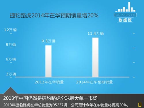 依托于目前國內(nèi)經(jīng)濟的快速發(fā)展,中國汽車市場也迎來了自己最好的時期。據(jù)可靠數(shù)據(jù)分析,中國最早將于2016年就可成為世界最大的豪華汽車市場。另外,2014年下半年捷豹路虎首款國產(chǎn)車型將在位于江蘇常熟的奇瑞捷豹路虎工廠正式下線,這將進一步加大捷豹路虎品牌在華的競爭力。由此來看,捷豹路虎2014年在華預(yù)期銷量增長20%并非不可能實現(xiàn)。