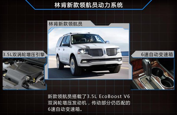 動力方面,林肯新款領航員將搭載一款3.5L EcoBoost V6雙渦輪增壓發動機,并取代現款車型所匹配的5.4L V8發動機。該款引擎的最大功率276kW,峰值扭矩582N·m。相比現款5.4L發動機,最大功率和峰值扭矩分別高出44kW/87N·m,排量降低的同時,動力性能進一步提升。傳動部分,則仍將匹配6速自動變速箱。