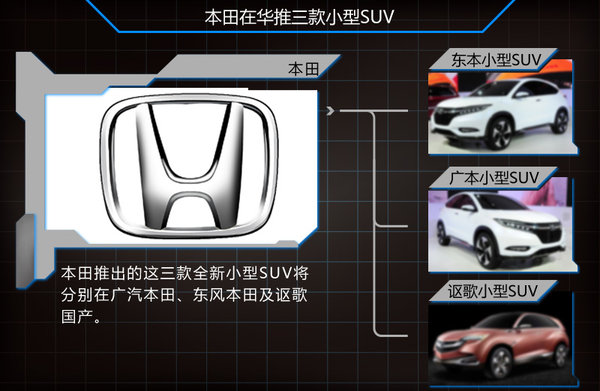 目前本田在華投產了東風本田緊湊級SUV CR-V及旗下謳歌品牌MDX 、ZDX 及RDX四款SUV車型。相比豐田、日產等競爭對手而言,其SUV車型陣容略顯單薄。隨著國內小型SUV市場的持續升溫,本田計劃在華投產的三款小型SUV也將彌補其在小型SUV市場的空白。