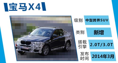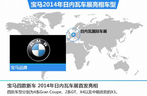 在今年1月份的底特律車展上,寶馬發布了如M3 Sedan、M4 Coupe在內的多款新車,即將開幕的日內瓦車展上(當地時間3月6日)寶馬將攜更多全新車型參展。記者為大家匯總了其即將參展的新產品,其中包括了2系GT、4系Gran Coupe、中期改款X3以及X4。在上述四款車型中,SUV已經占據了總數量的一半。