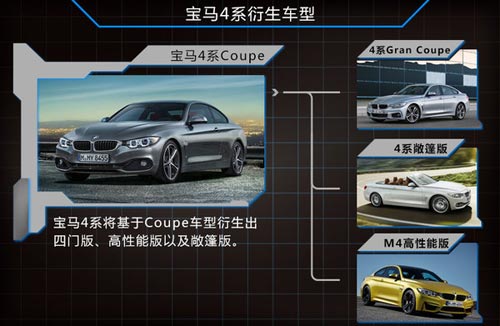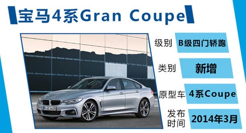 寶馬在底特律車展上發布了M4 Coupe后,在日內瓦車展上其還將亮相4系的另一位新成員——4系Gran Coupe。新車在外觀設計上基本與4系Coupe保持一致,只是由雙門變為四門,這也解決了4系雙門后排空間不足的缺陷。隨著M4 Coupe以及4系Gran Coupe的推出,寶馬4系家族成員將再添新丁。