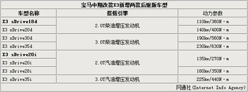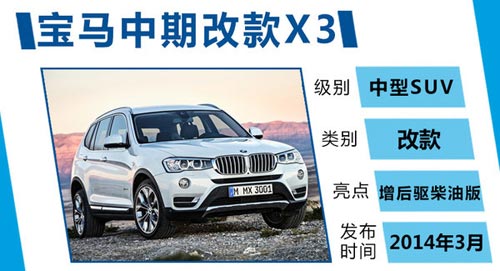 寶馬在今年春節期間發布了中期改款X3的官方圖片,新車在外觀設計上已經趨向于最新的家族設計,其開眼角式的前大燈與即將上市的全新X5保持著高度的相似。在動力以及驅動系統上,新車還增添了兩款后驅車型,分別為sDrive18d、sDrive20i,前者搭載了2.0T柴油增壓引擎,后者則繼續使用寶馬N20系列的2.0T低功率發動機。