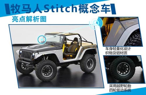 Jeep牧馬人Stitch概念車車身采用輕量化設計,車體結構使用了高強度鋼材,而車身外殼則采用了鋁制材料和織物,從而使車身重量大幅降低,進一步提升燃油經濟性。牧馬人Stitch概念車的外觀設計則更顯硬朗,更好的結合性能與舒適度,大尺寸的越野輪胎將為車輛提供較強的抓地性,該車型還將采用四輪驅動系統。