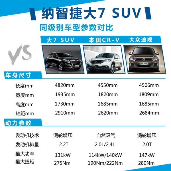 新款大7 SUV的長(zhǎng)寬高分別為為4820mm/1935mm/1730mm,軸距為2910mm,與現(xiàn)款一致。動(dòng)力方面,新車依舊搭載一臺(tái)2.2T渦輪增壓發(fā)動(dòng)機(jī),最大功率131kW,峰值扭矩為275Nm,與之匹配的是一臺(tái)5速手自一體變速箱。相比競(jìng)爭(zhēng)車型本田CR-V、大眾途觀,該車在車身尺寸上略勝一籌,在動(dòng)力對(duì)比中,大眾途觀高比分勝出。現(xiàn)款納智捷大7 SUV售價(jià)在22.40-27.48萬(wàn)之間,新款進(jìn)行全面升級(jí)后售價(jià)基本保持不變。相比兩款競(jìng)爭(zhēng)車型,大7 SUV售價(jià)具有一定優(yōu)勢(shì)。