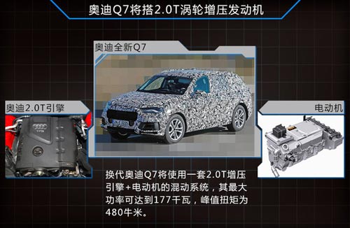 在現有的奧迪Q7車型中,車輛搭載了一款3.0T機械增壓引擎。為順應全球市場“小排量,增壓化”的趨勢,奧迪也將推出一款搭載2.0T柴油發動機的Q7車型。奧迪汽車首席執行官施耐德表示:“奧迪新一代Q7將配備混合動力系統,并且采用電動馬達驅動后輪實現四驅?!睋私?,2.0TFSI發動機與電動機的動力組合,最大功率為177千瓦,峰值扭矩達到480牛米。根據乘用車消費稅稅率計算,在使用全新的2.0T發動機后,奧迪Q7的消費稅稅率將下調7個百分點,屆時換代車型的入門價格有望大幅降低。