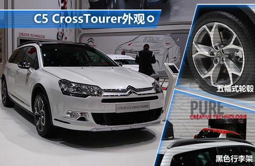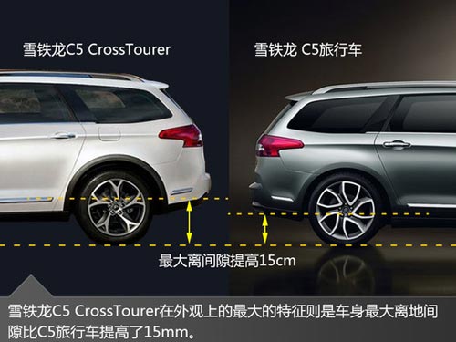 作為雪鐵龍C5旅行車的跨界版本,雪鐵龍C5 CrossTourer在外觀上的最大的特征則是車身最大離地間隙比C5旅行車提高了15mm。新車外觀設計基于C5旅行版打造,但其四個車輪拱、側裙均增加了黑色包圍裝飾,前后保險杠也加裝銀色護板,與旅行跨界車的定位更加匹配。車頂還配備了黑色行李架,增添了跨界風格。此外,C5 CrossTourer造型獨特的大尺寸五幅式輪轂也是該車的專屬裝備。同時車尾部的“CrossTourer”字樣標識成為表明身份的象征。